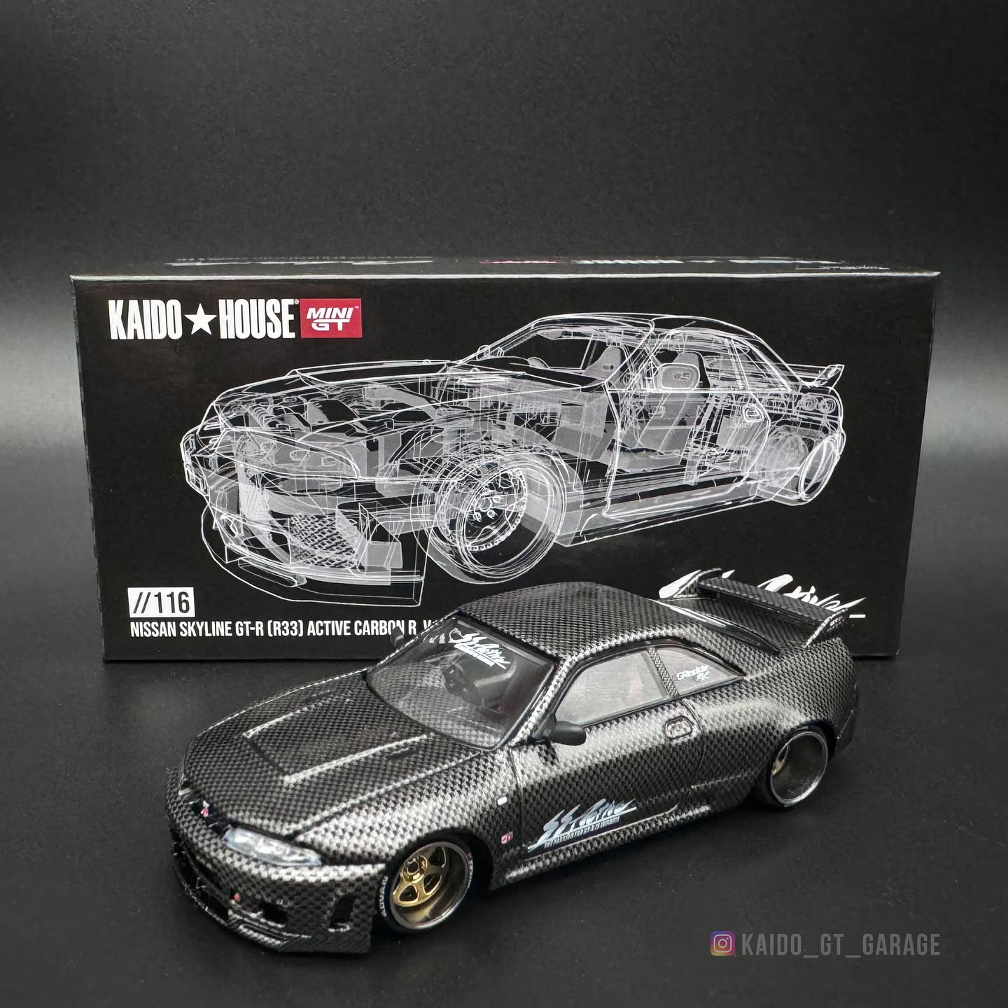 The Kaido House x Mini GT Nissan Skyline GT-R (R33) Active Carbon R V1 Standard Edition is a bold 1:64 scale collectible that brings Kaido’s signature style to the legendary R33. Finished in an aggressive carbon-inspired livery, it highlights the wide-body stance, detailed aero kit, and racing-inspired design. Built with an all-metal body, opening hood, and finely detailed engine, it offers both authenticity and premium craftsmanship. Alloy wheels with rubber tires complete the look, making it a standout piece for display. Stylish and powerful, the Standard Edition is a must-have for JDM and Skyline enthusiasts.