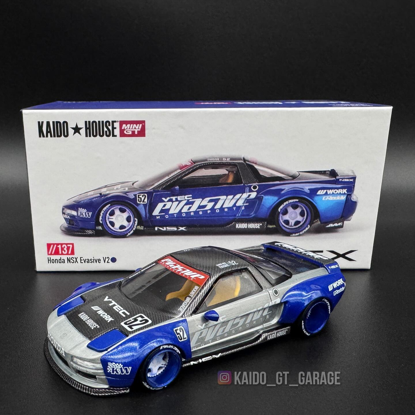 The Kaido House KHMG137 Honda NSX Evasive V2 Chase stands out from the standard version with its exclusive colorway and special finish. While the regular edition features the iconic Evasive Motorsports livery, the chase version offers a rare, eye-catching variation that makes it instantly recognizable. Produced in very limited numbers, this chase piece adds an extra layer of rarity and uniqueness to the collection, making it even more desirable than the standard release.